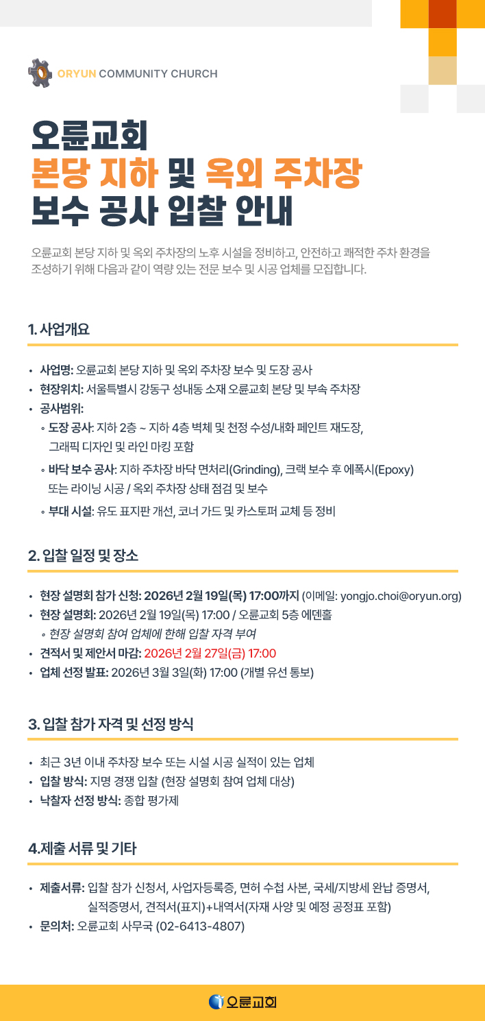 오륜교회 본당 지하 및 옥외 주차장 보수 공사 입찰 공고